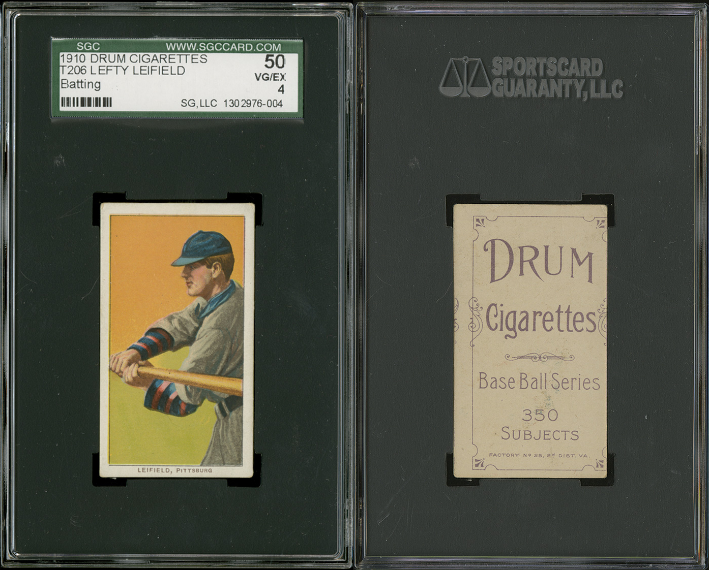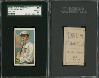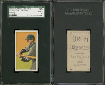 Robert Edward Auctions representative Brian Dwyer recently picked up a consignment for their upcoming spring auction: a collection of T206s that included 516 of the 524 cards in the set. They were stored raw in 16-count pocket pages, back to back. After Dwyer returned to the office and began removing the cards from the pages, he found that two cards have Broad Leaf 350 advertising backs (Anderson, J. Tannehill) and two have Drum 350 advertising backs. The two Drums were Leifield (Batting) and Conroy (With Bat).