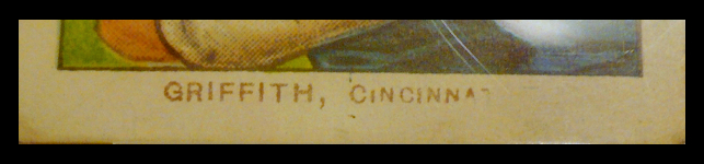 Which brings me to a card that I have owned since 2004. It is a Clark Griffith batting pose that is missing all of the last "I" Cincinnati, as well as 90 percent of the "T" and half of the "A." After examining the card to make sure it wasn't missing paper or altered, I became interested in finding more examples. For full disclosure, the card was purchased from an auction run by James Verrill/Baseball Vintage, now a defunct site, and no mention was made of the missing letters in the title or description.