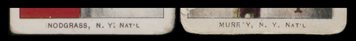 November 28, 2012 -- The T206 set has some fairly popular printing variations that involve letters missing from either the player or team names. The most famous is the "NODGRASS" version of the Fred Snodgrass batting pose, with most of the first "S" in "SNODGRASS" missing. A Red Murray portrait card encapsulated with his name spelled "MURR'Y" sold for nearly $9,000 in 2007. There are also versions with "FRED MITCHELL, TORONT," missing the last "O" in "Toronto" and Charlie Hemphill, with the first "H" missing.
