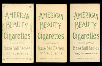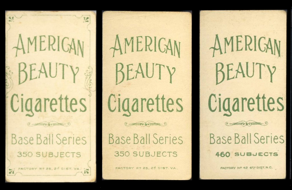 American Beauty backs were issued with three different designs printed in green. The first was the 350 Series back with an ornate frame using group 2 (350 Only) and group 5 (Super Print) subjects. The second was the 350 Series back without the ornate frame using group 3 (350-460) subjects. The third back was printed during the 460 Series using subjects from group 3 and 4 (460 Only.) Both of the 350 Series backs were issued out of Factory 25, Virginia, while the 460 Series back was issued out of Factory 42, North Carolina. For reasons still undetermined, all of the American Beauty cards received one or two additional vertical cuts to make the cards thinner than a standard size T206. One popular theory is that the packaging for this brand was thinner, but this has not been substantiated. Whatever the reason, the extra cutting was continued for all of the T206 American Beauty backs as well for other similar tobacco cards packaged with the American Beauty product.