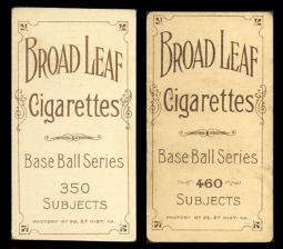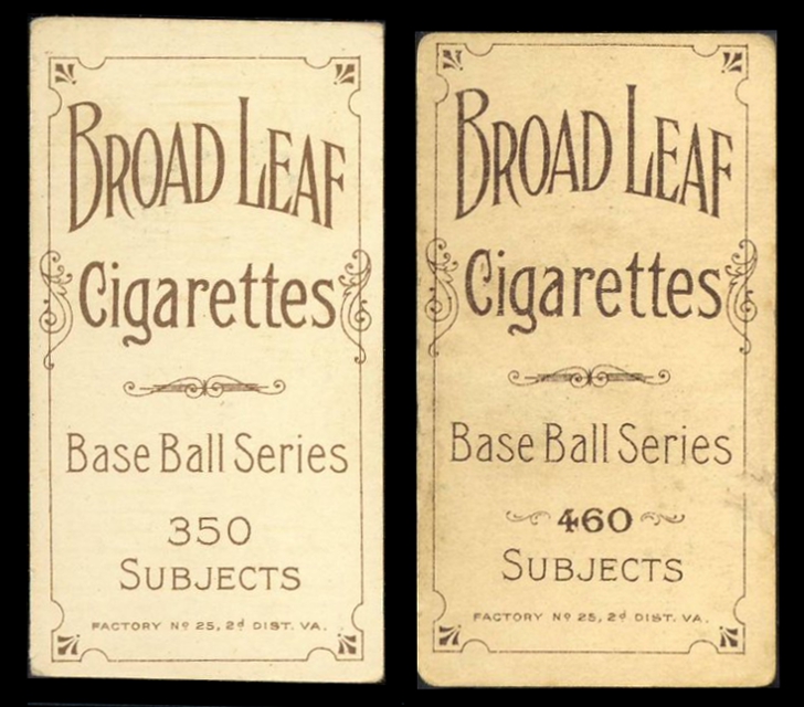 Broad Leaf backs were issued with two different designs printed in dark brown. The first was the 350 Series back using group 2 (350 Only) and group 5 (Super Print) subjects. The second was the 460 Series back using group 3 (350-460) and group 5 (Super Print) subjects. Both Broad Leaf backs are ranked high on the scarcity list, but the Broad Leaf 460 is amongst the rarest. Both Broad Leaf backs were issued out of Factory 25, Virginia.