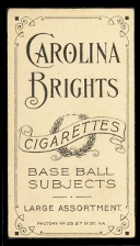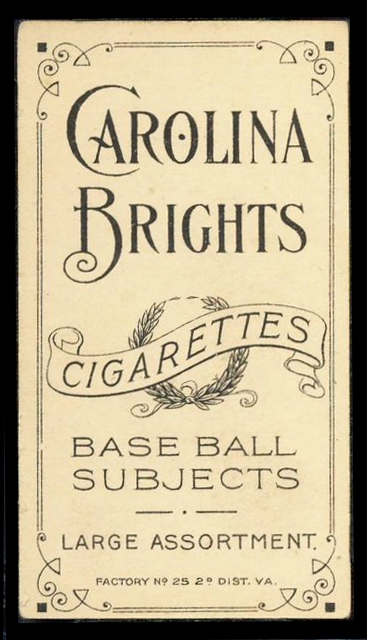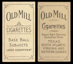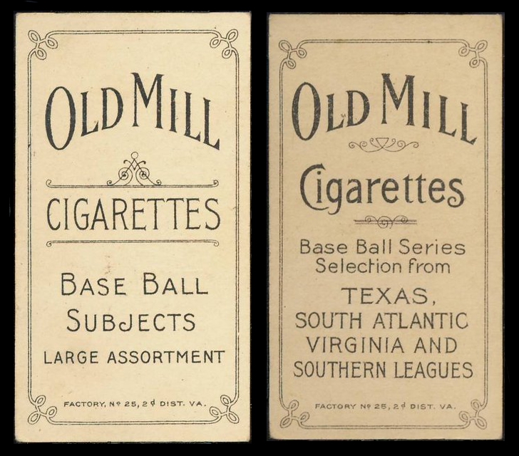 Old Mill backs were issued with two designs, both printed in black. These advertisements are classified as assorted-brand backs specifying no series. The Old Mill Southern League (SL) back was designed specifically for group 6 subjects and listed the four leagues they represented. The Old Mill (SL) back was printed during the early 350 Series. The Old Mill Base Ball Subjects (BBS) back was first printed during the 350 Series using group 1 subjects. Additional printings of the BBS back during the 350 and 460 Series included subjects from groups 2,3,4 and 5. All Old Mill backs were issued out of Factory 25, Virginia.