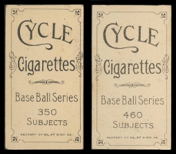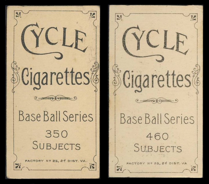 Cycle backs were issued with two different designs printed in black. The first was the 350 Series back using group 2 (350 Only) and group 5 (Super Print) subjects. The second was the 460 Series using group 3 (350-460), group 4 (460 Only) and group 5 (Super Print) subjects. Both Cycle backs were issued out of Factory 25, Virginia.