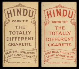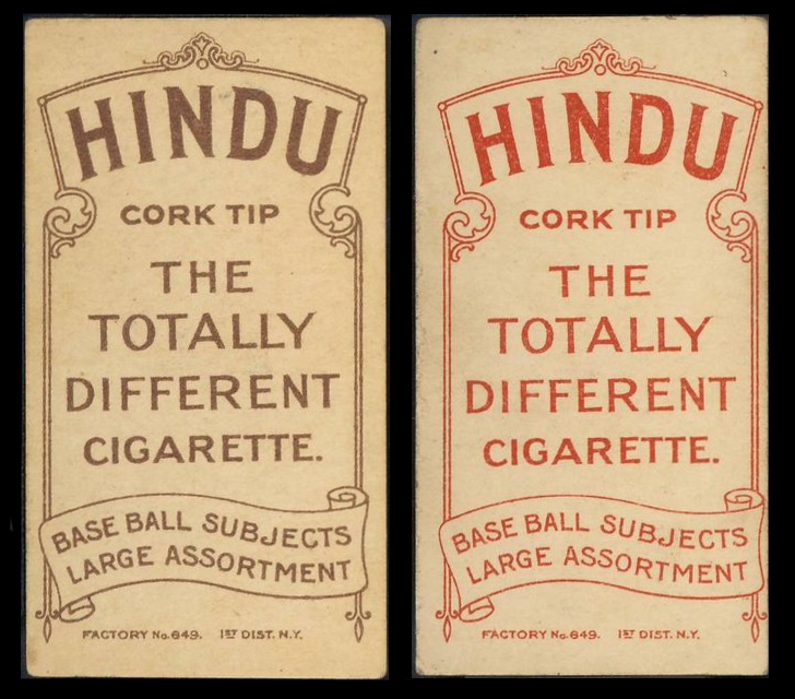Hindu backs were issued with one design and printed in both brown and red. These advertisements are classified as assorted-brand backs specifying no series. The first back was printed in brown during the 150 Series using group 1 (150-350) and group 6 (Southern League) subjects. The second back was printed in red during the 460 Series using subjects from group 3 (350-460), group 4 (460 Only) and group 5 (Super Print.) Both brown and red Hindu backs were issued out of Factory 649, New York.