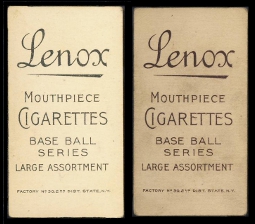 Lenox backs were issued with one design and printed in black and brown. This advertisement is classified as an assorted-brand back specifying no series. The black were printed during the 460 Series using group 3 (350-460), group 4 (460 Only) and group 5 (Super Print) subjects. The brown also were printed during the 460 Series using group 3 and 4 subjects. It's unlikely a group 5 subject will be found with a brown Lenox back, but it cannot be said with absolute certainty at this point. All Lenox backs were issued out of Factory 30, New York.