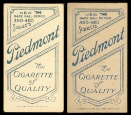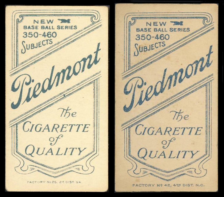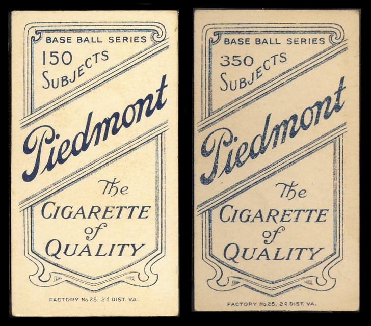 Piedmont backs were issued with four different designs printed in blue. The Piedmont backs in total were printed more often and with more subjects that any other brand. The first back issued was Piedmont 150 which was printed several times during the 150 Series using only subjects from group 1 (150-350.) The second back issued was the 350 Series, and through the progression of the set ultimately would include subjects from groups 1, 2 (350 Only), 3 (350-460), 5 (Super Print) and 6 (Southern League.) The third back issued was the 350-460 Factory 25. This back was printed during the 460 Series and included groups 3, 4 and 5. The fourth back was the 350-460 Factory 42, which is far more scarce than any other Piedmont. This back was printed during the 460 Series with subjects from groups 3, 4 and 5 and can be found in several varying shades of blue.