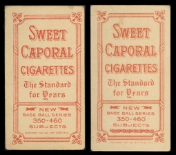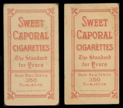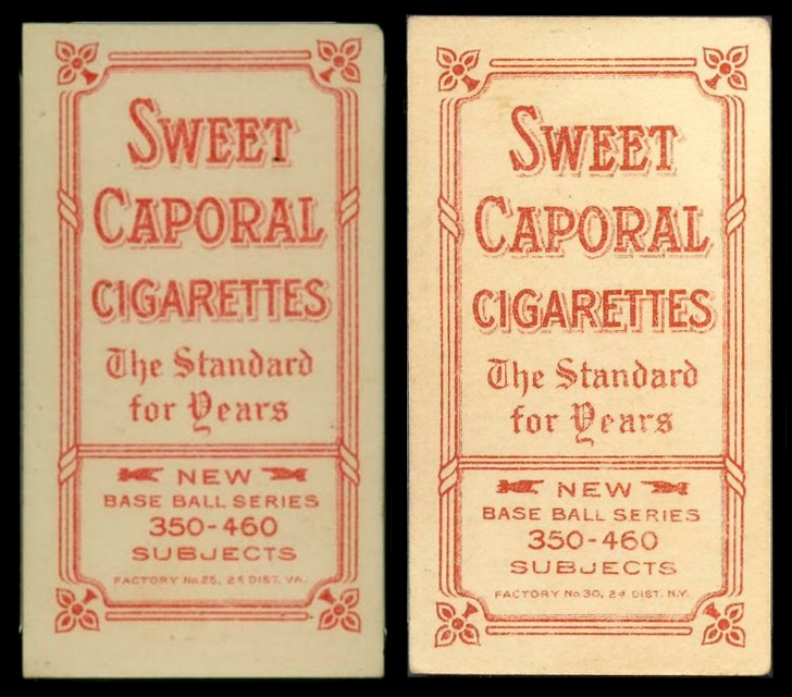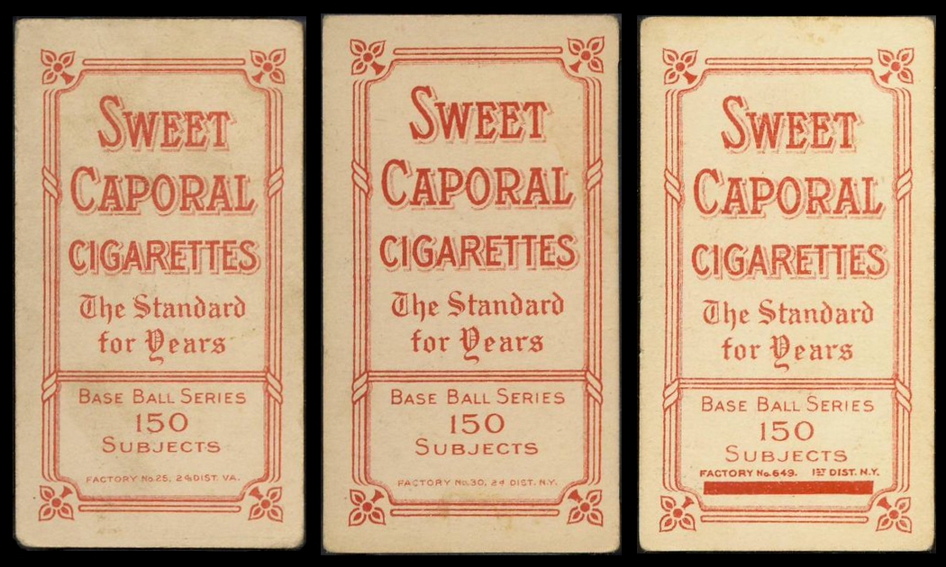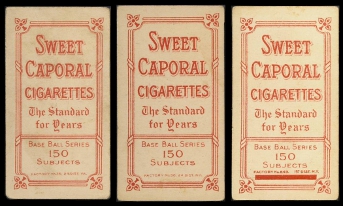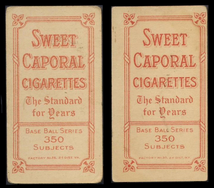 Sweet Caporal backs were issued with nine different designs printed in red. The first two backs issued were the 150 Series Factory 25 and Factory 30 and were printed using group 1 (150-350) subjects. The third is the 150 Series Factory 649 overprint. Thirty four subjects were printed with this back and it's believed to have been printed concurrently with the brown Hindu back. The fourth and fifth backs are the 350 Series Factory 25 and 30. These two backs were printed multiple times during different print groups and include groups 1, 2 (350 Only), 3 (350-460) and 5 (Super Print) subjects. The 150 and 350 Series Sweet Caporal backs were issued out of Factory 25; Virginia, and Factory 30, 2nd Dist. New York. The 150 Series with factory overprint were issued out of Factory 649, 1st Dist. New York. These overprints originally were printed with a Factory 30 designation.