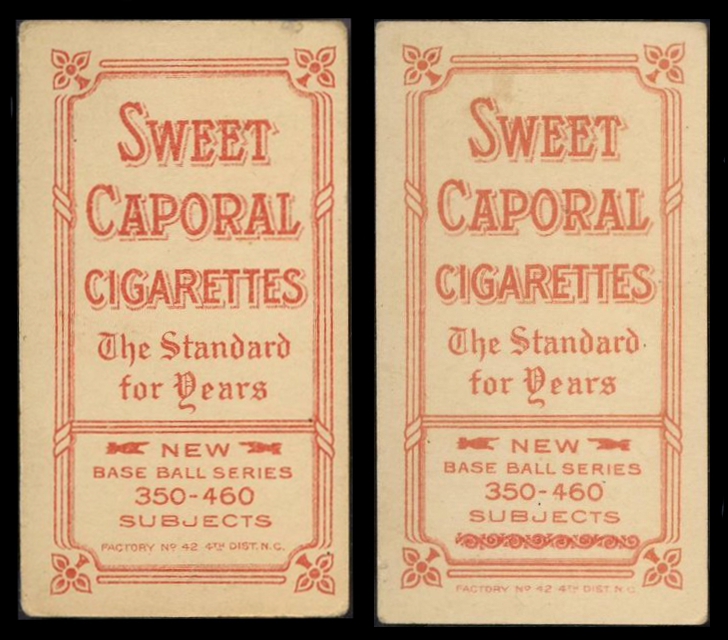 During production of the 460 Series, four different Sweet Caporal backs were printed. These backs were printed using subjects from groups 3, 4 and 5. A majority of the 460 Series subjects were printed with three of these backs, but only group 5 (Super Print) subjects were issued with all four. The Factory 42 overprint back is the only 350-460 Sweet Caporal back that all 109 available subjects were issued with. These overprints originally were printed with a Factory 30 back. The issued Factory 30 back is thought to mirror the Sovereign 460 group and includes only group 4 and 5 subjects. The Factory 42 no-overprint group is thought to mirror the red Hindu group. The Factory 25 back is thought to be the more difficult to find of the four and was printed using group 3, 4 and 5 subjects. The 350-460 Sweet Caporal backs were issued out of Factory 25, Virginia; Factory 30, New York; and Factory 42, North Carolina.