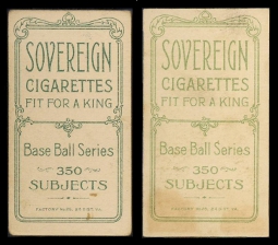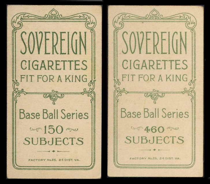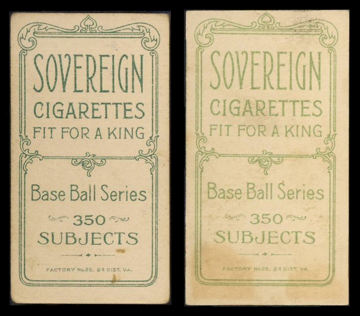 Sovereign backs were issued with three different designs printed in either forest or apple green. The first is the 150 Series forest green back using group 1 (150-350) subjects. The checklist for this back is thought to be the original 150 Subjects offered in the set. The second is the 350 Series forest green backs using group 1 and group 2 (350 Only) subjects. The third Sovereign back is the 350 Series apple green backs printed using group 3 (350-460) and group 5 (Super Print) subjects. The fourth back is the 460 Series forest green and was printed using group 4 (460 Only) and group 5 subjects. If there is a question as to whether a subject was part of group 2, 3 or 4, the Sovereign back that he was printed with is the determining factor. All Sovereign backs were issued out of Factory 25, Virginia.