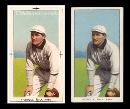 The Nicholls proof is interesting because it exhibits several art differences from the T206 that was used for production. Faint lines on the cap and a large "A" on the chest of Nicholls can be seen on the production image, but both are missing from the Type 2 proof.