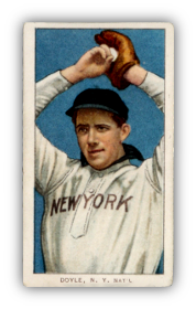 When print group 3 first began production, the Joe Doyle caption incorrectly identified him with the N.Y. Nat'l team. Joe actually played for the American League N.Y. Highlanders, and it has been theorized that printers confused him with Larry Doyle, who played for the N.Y. Nat'l team. Whatever the reason, the error quickly was caught and the league designation of "Nat'l" was removed. Because of the timely correction, this variation can be found only with a Piedmont 350 back, and the number printed and distributed were low.